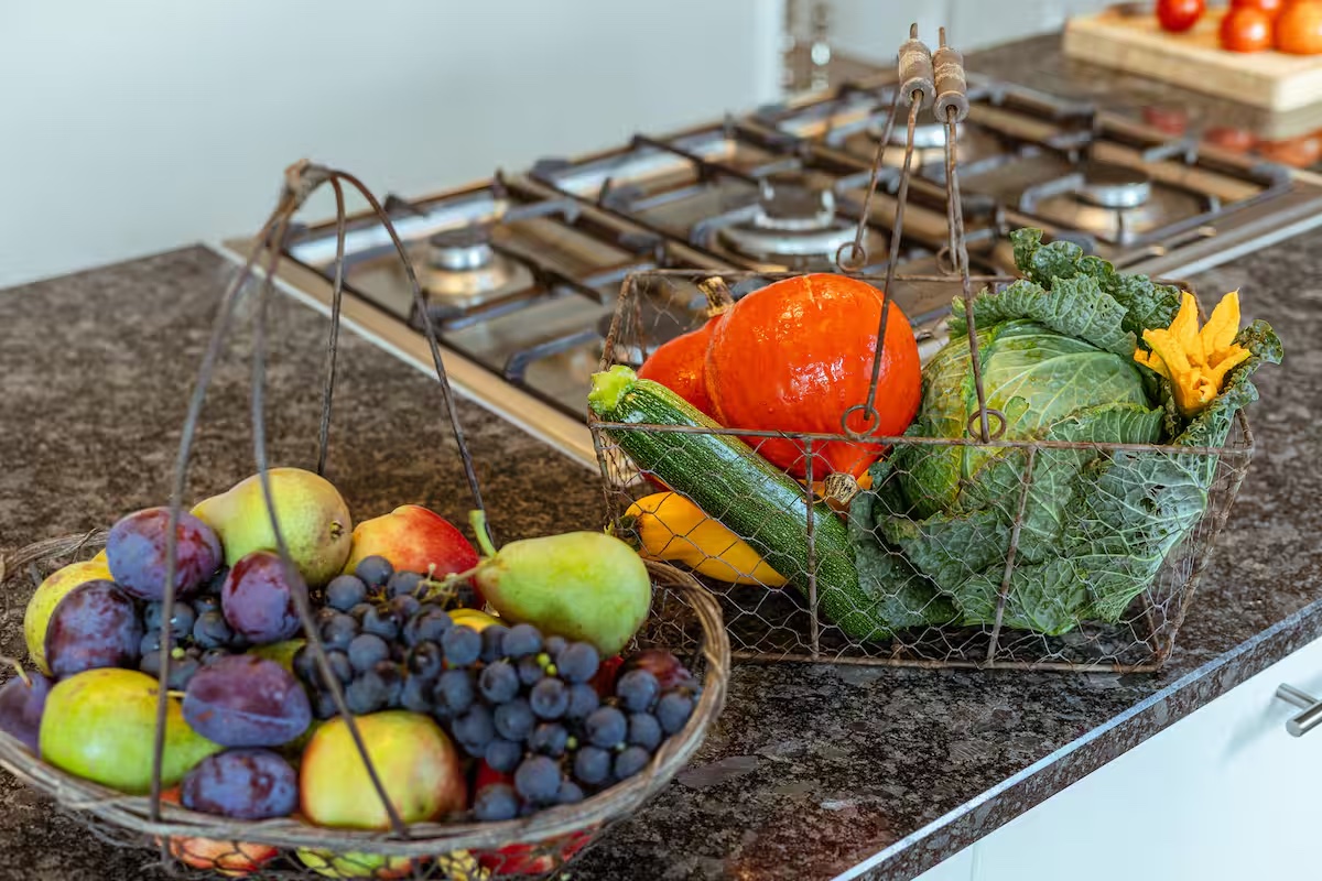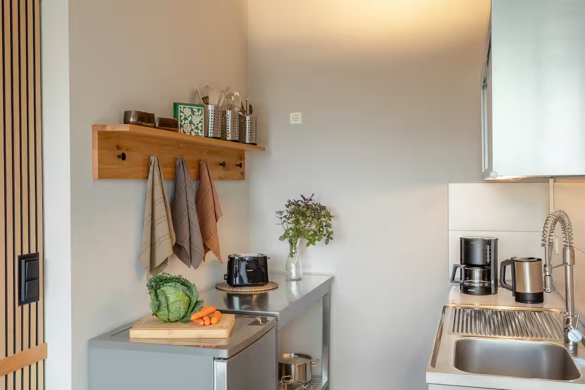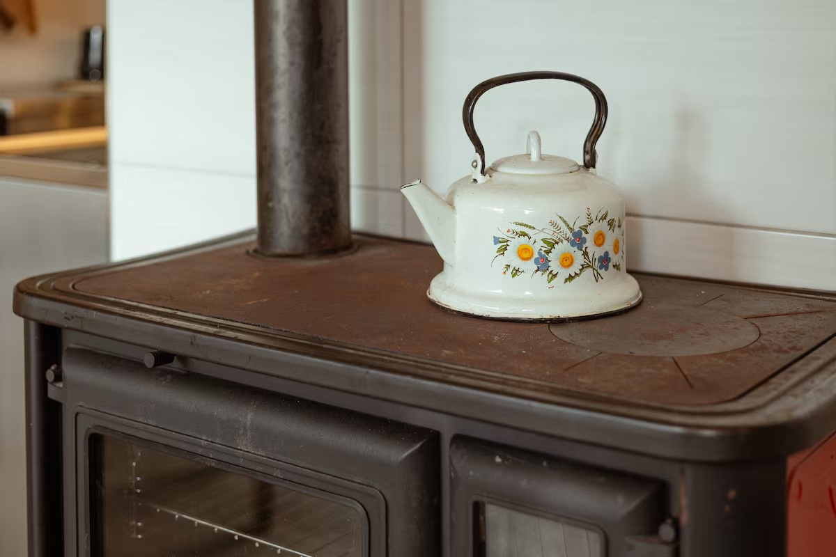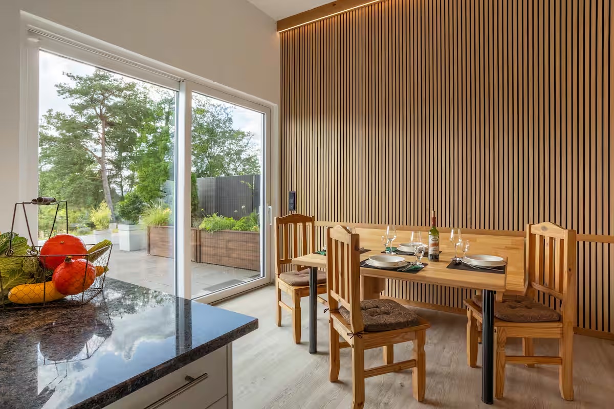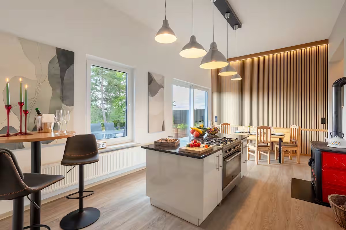Das Herzstück des Hauses ist der großzügige Wohn-, Küchen- und Essbereich mit hohen Decken, einer großen Kücheninsel mit Gasherd und einem traditionellen Kaminherd, auf dem du wie in früheren Zeiten mit Holz kochen kannst. Hier wird gemeinsames Kochen zum Erlebnis – perfekt für gesellige Abende mit Familie oder Freunden.