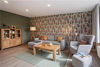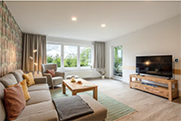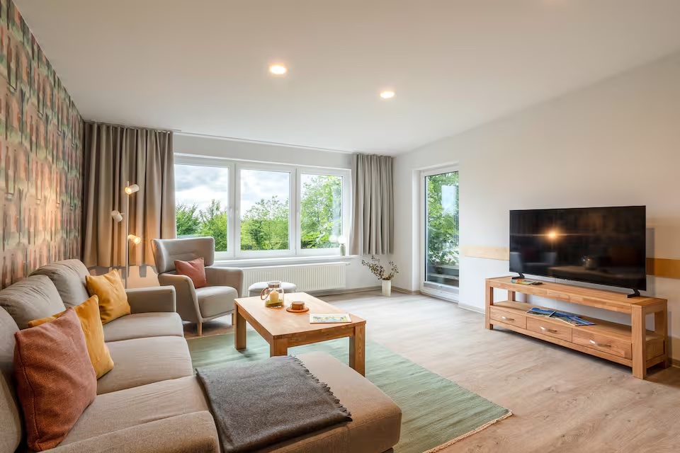 Nach einem aktiven Tag lädt das gemütliche Wohnzimmer mit bequemen Sofas und großem Fernseher dazu ein, den Abend gemeinsam ausklingen zu lassen – bei einem Glas Wein, einem guten Film oder einfach im Gespräch.